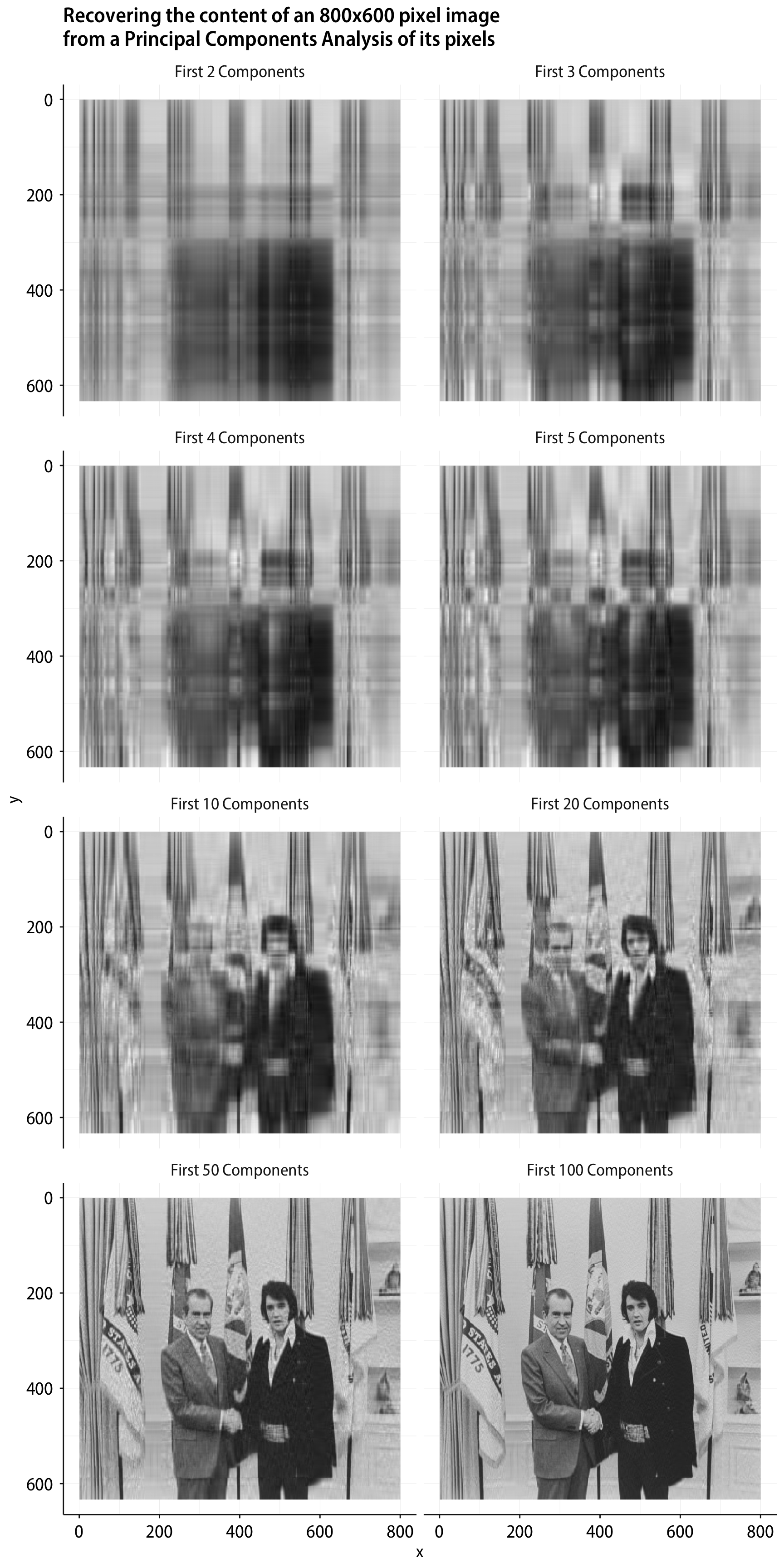 labs(title = "Recovering the content of an 800x600 pixel image\nfrom a Principal Components Analysis of its pixels") +