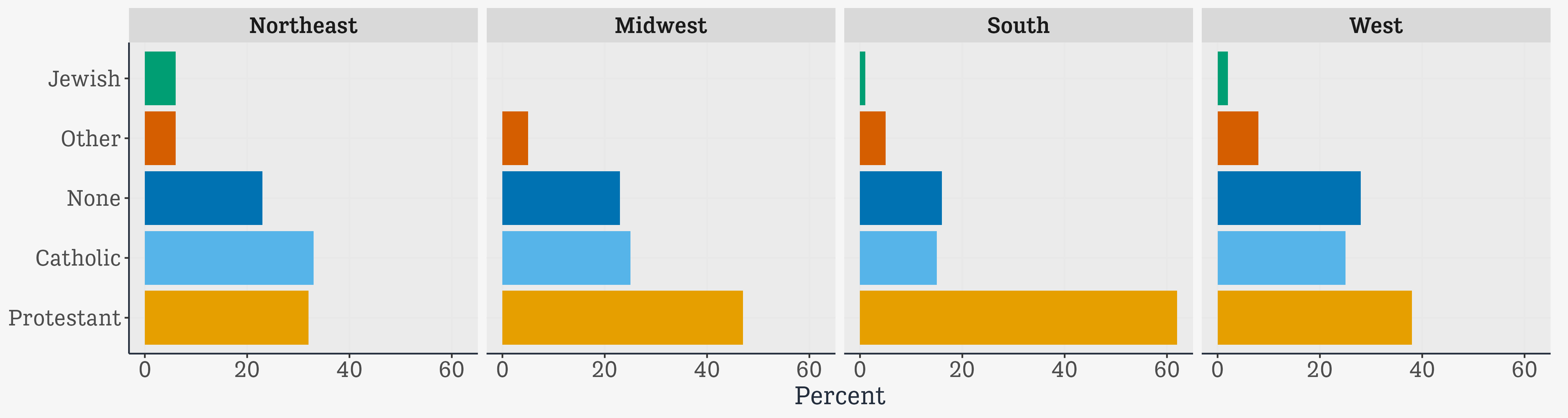 | religion | Northeast | Midwest | South | West |