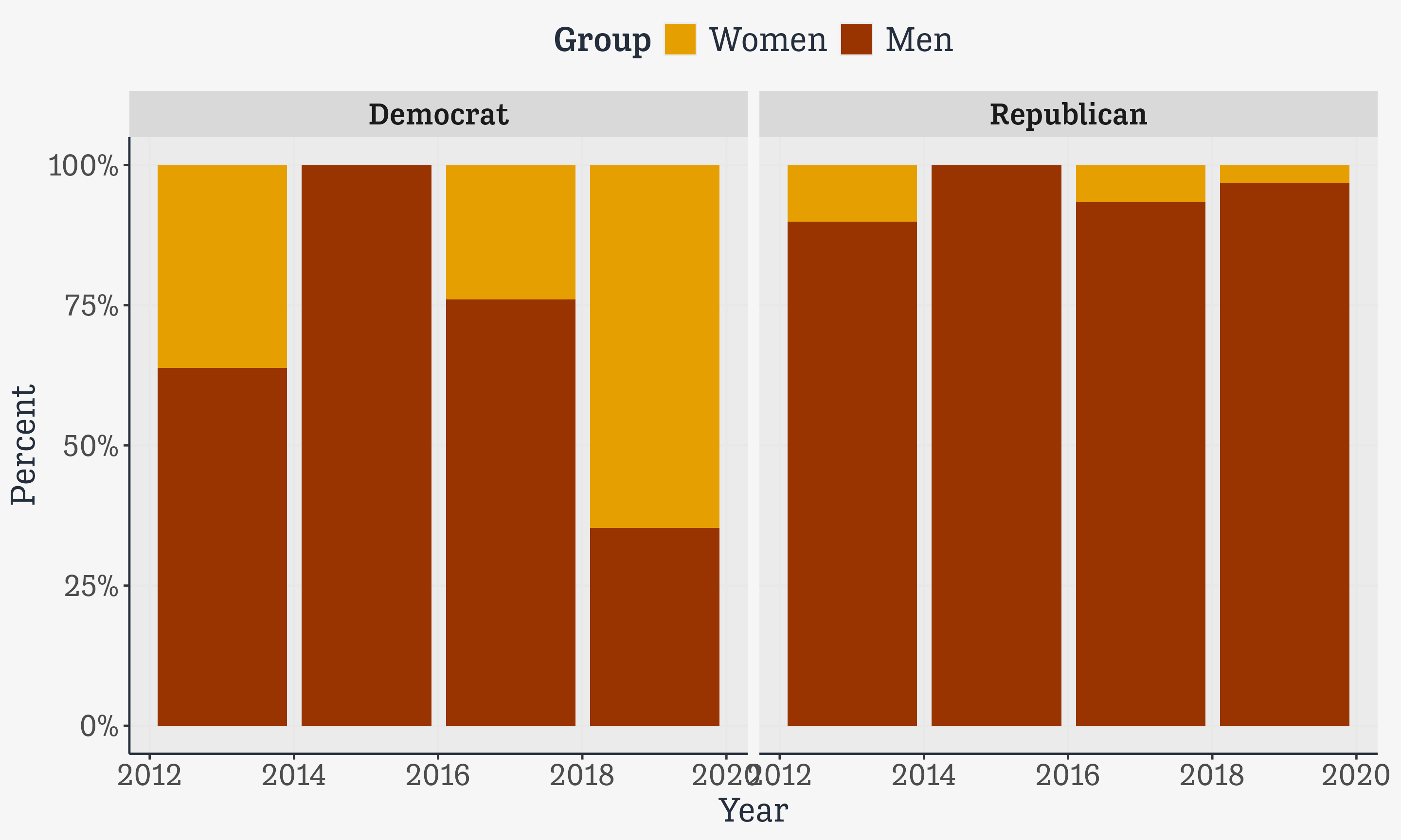 group_by(start_year, party, sex) |>