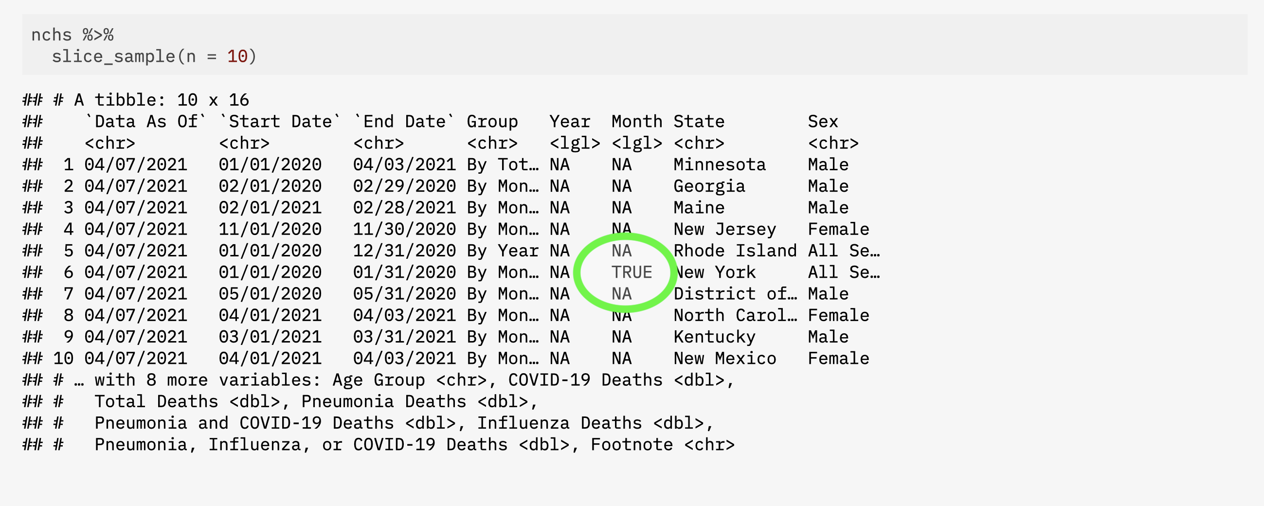 age imported in character format?Absent you giving them a column specification, the read_ functions try to guess what the type of each column is. They do this by looking at the first thousand rows of each column. They may guess incorrectly!