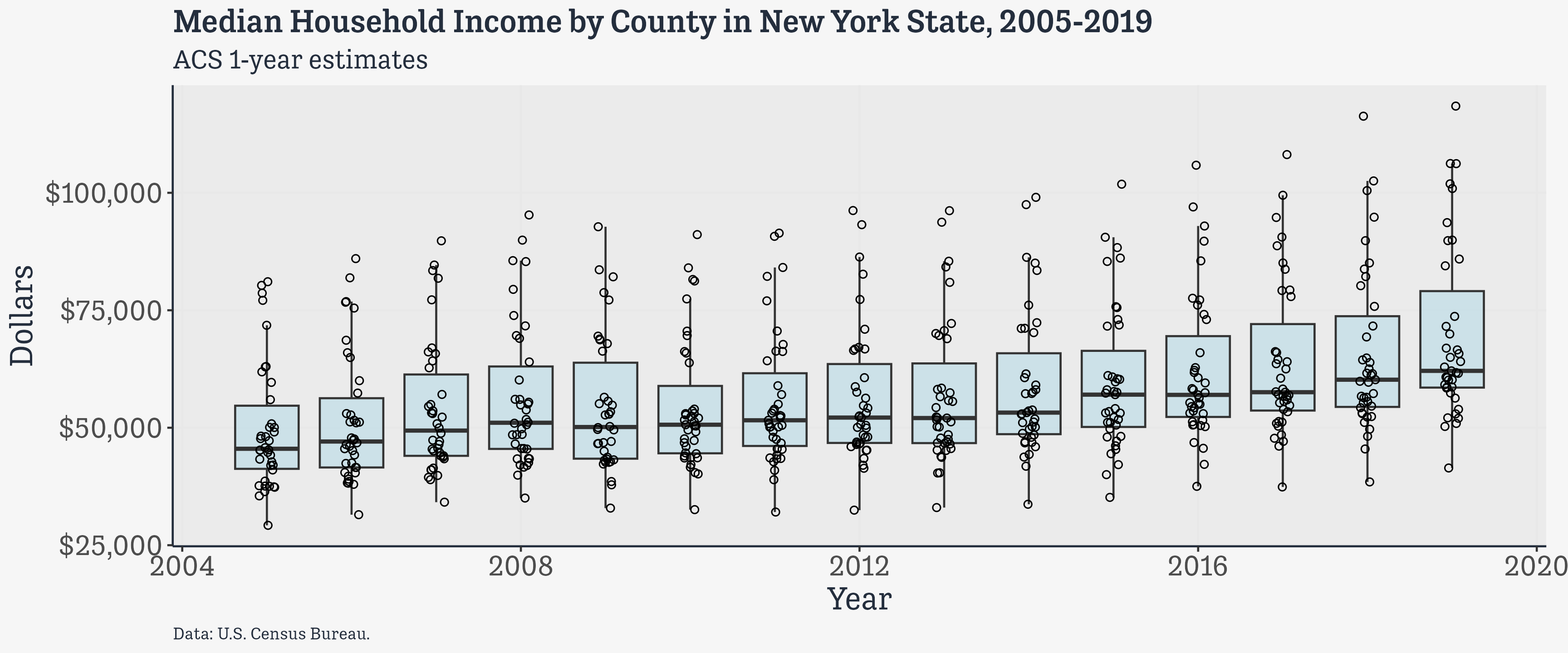 labs(x = "Year", y = "Dollars", title = "Median Household Income by County in New York State, 2005-2019",